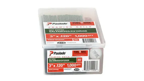 Our Hot Dipped Galvanized Nails offer premium corrosion protection and reduce staining and streaking by 80%. They are designed and manufactured to match the specs of Paslode nailers so your nailer will run smooth, with fewer misfires and jams while driving flush, even into the toughest materials. They're IRC R319.3 code approved for use in pressure treated lumber in accordance with ASTM A 153.